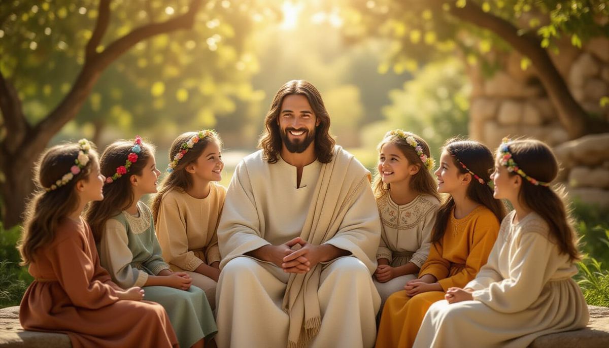 This image shows Jesus Christ in a simple tunic, seated on a stone bench, blessing the children around him. The scene is bathed in golden light, with a warm, spiritual atmosphere in a realistic style.
