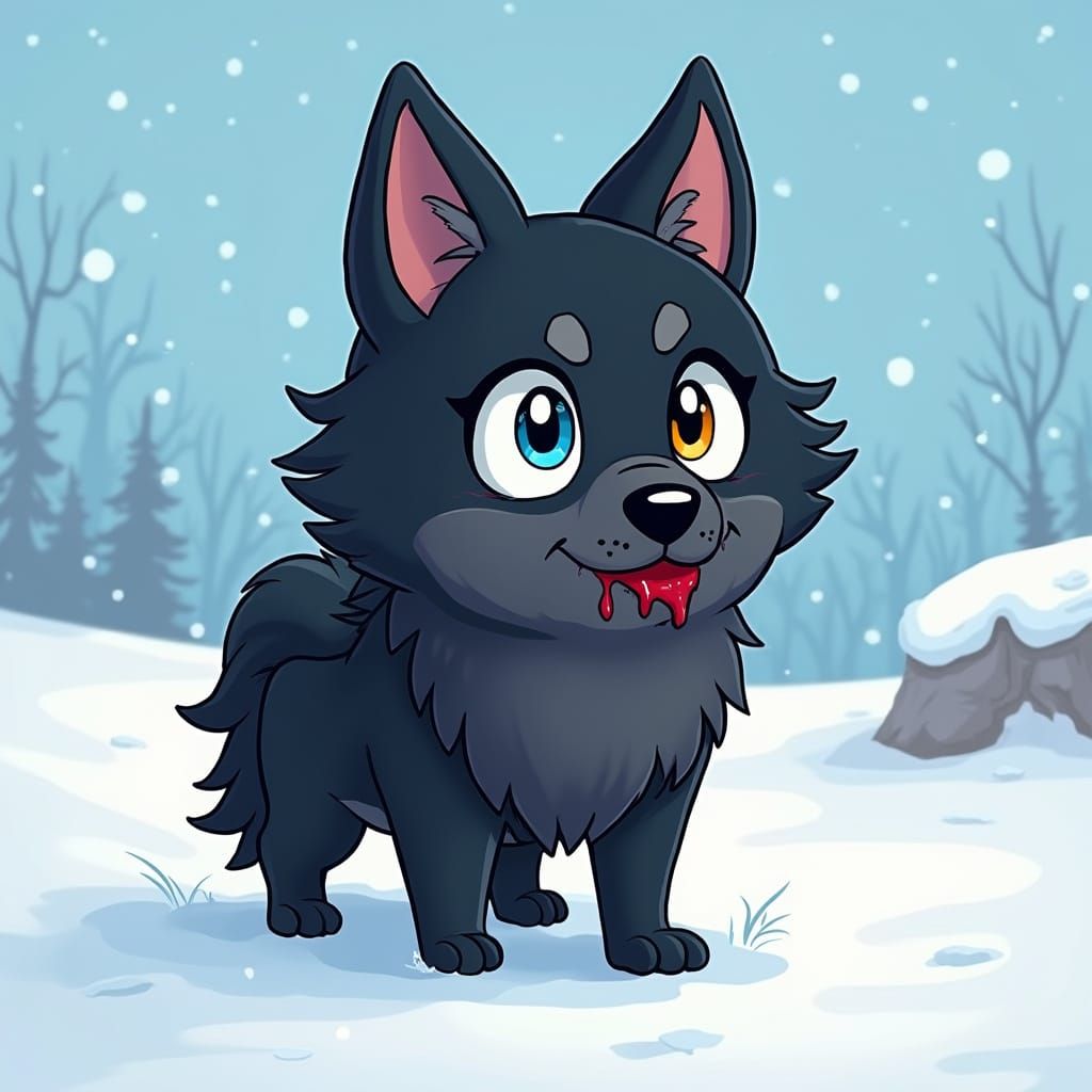 A cartoon-style image of a black husky in a snowy landscape. The dog has heterochromia, with one blue eye and one amber eye, and blood around its mouth, rendered in a vibrant cartoon style.