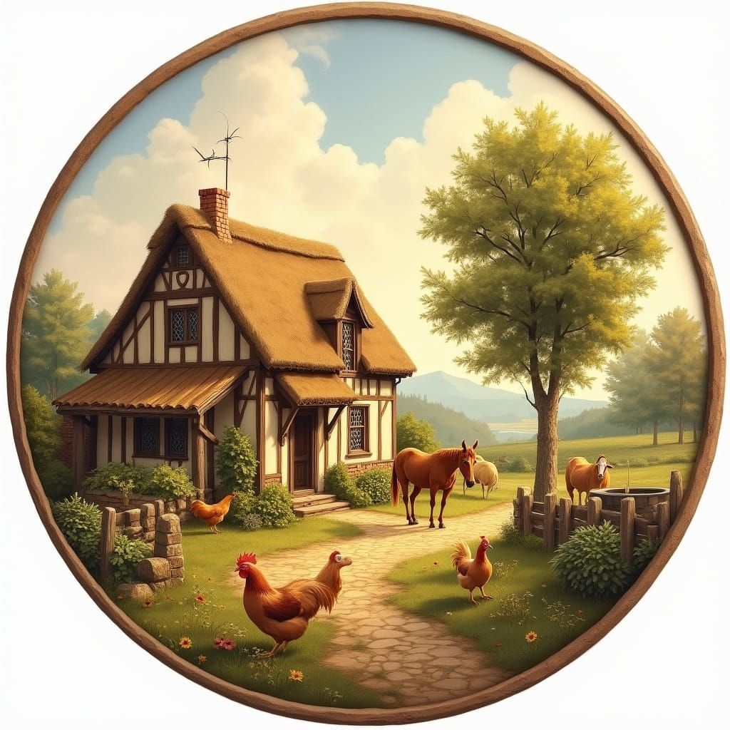 This image depicts a serene rural scene, reminiscent of Old Master paintings, featuring a half-timbered farmhouse with a thatched roof, surrounded by lush greenery and warm golden light, evoking the rustic charm of a hand-painted fresco.