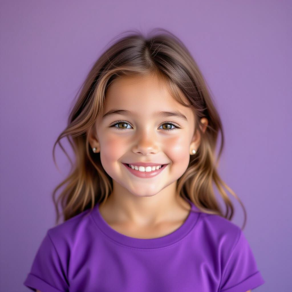 This image shows a stunning, photorealistic portrait of a smiling 8-year-old girl with light brown hair. She wears a purple t-shirt against a soft purple backdrop, captured with gentle lighting and high detail.