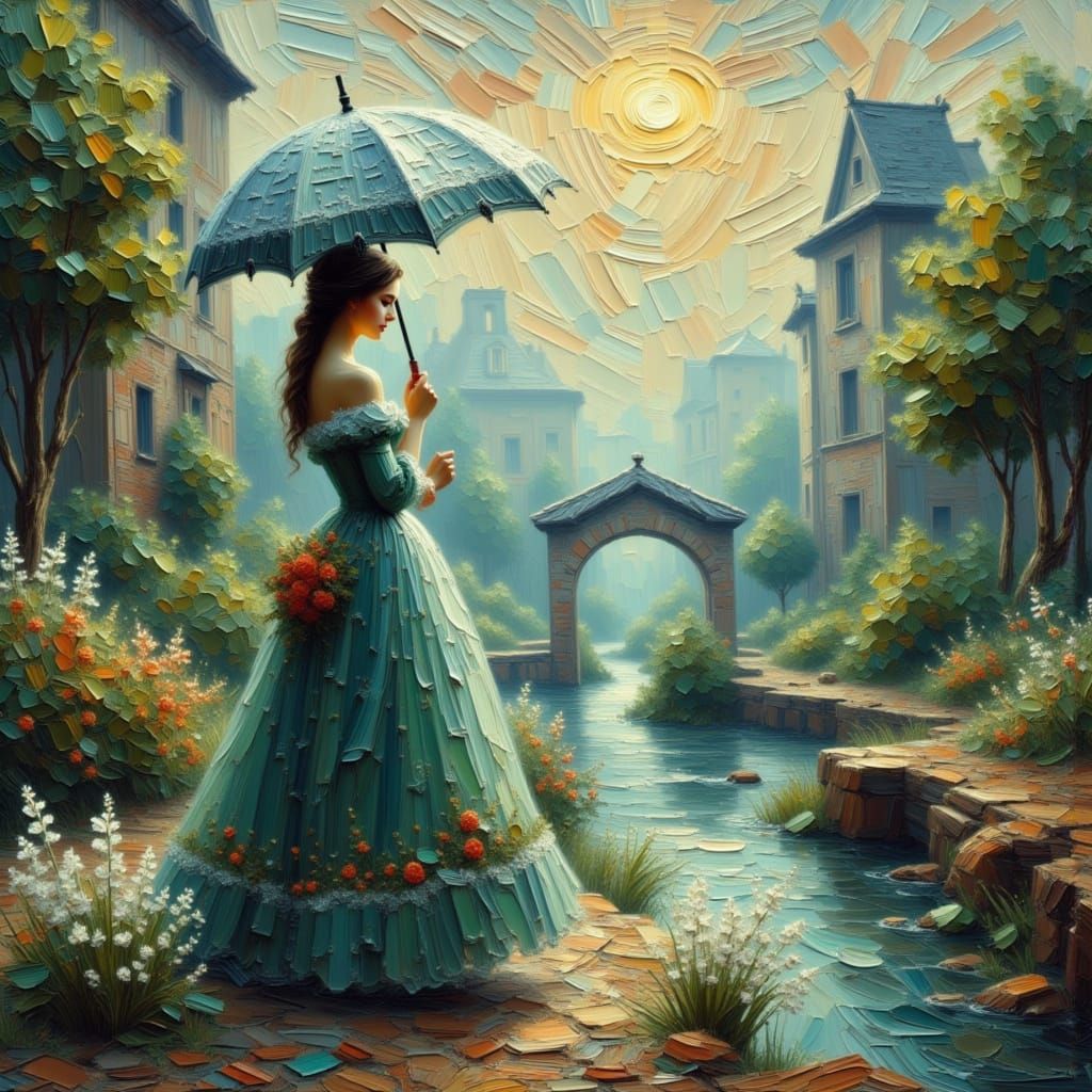 <lora:MidjourneyBeauties:1.0> <lora:Dreamy Impasto:1.0> <lora:Dreamy Paintings:1.0> <lora:Virtua-Impasto:1.0> A thickly impasto painting of a beautiful woman from the 18th century with an umbrella covered with frost, a 3D projection of a hologram from a thick fog, a miniature landscape comes to life:an ...