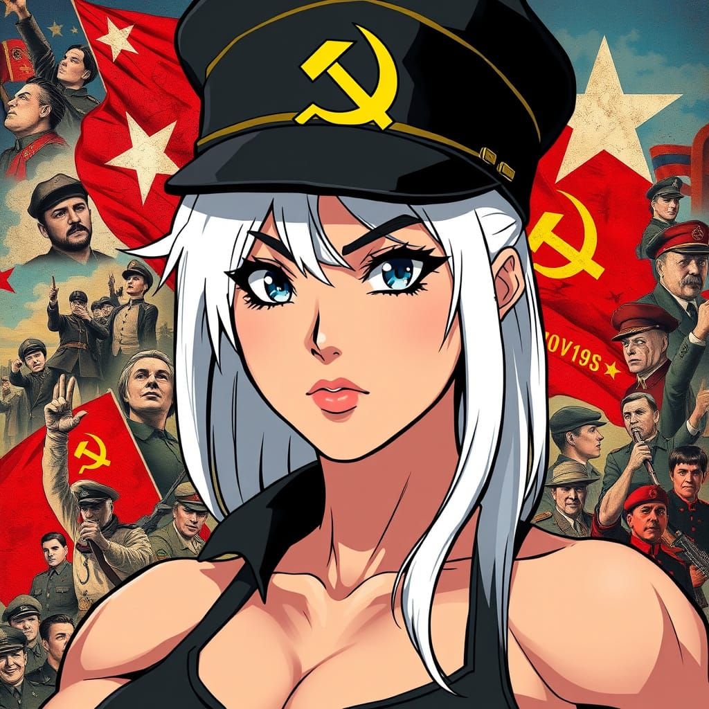 This image shows a strong anime-style woman with distinctive features in a Soviet-era propaganda art style. The artwork features bold lines and dynamic composition, reminiscent of anime and Pixiv art.