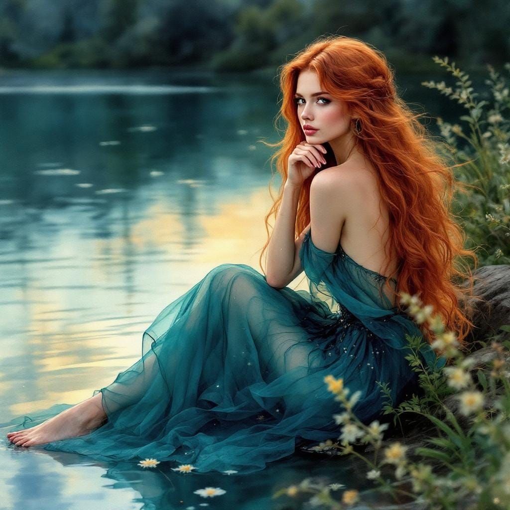 A serene watercolor painting of a beautiful woman with long auburn hair sitting by a lake. The soft, diffused light creates a dreamy, romantic atmosphere using wet-on-wet watercolor techniques.