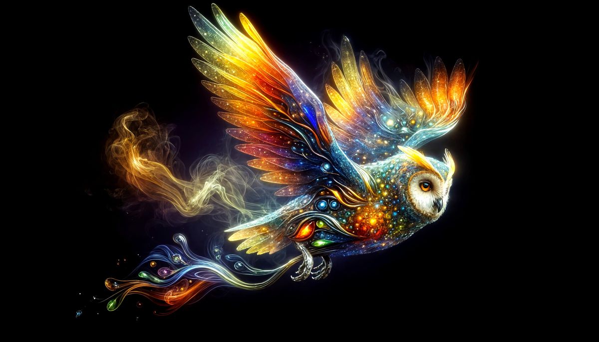 A vibrant image of a large owl seemingly made of stained glass in flight. The magical bird has a smokey aura and subtle sparkling highlights, giving it a mystical quality.
