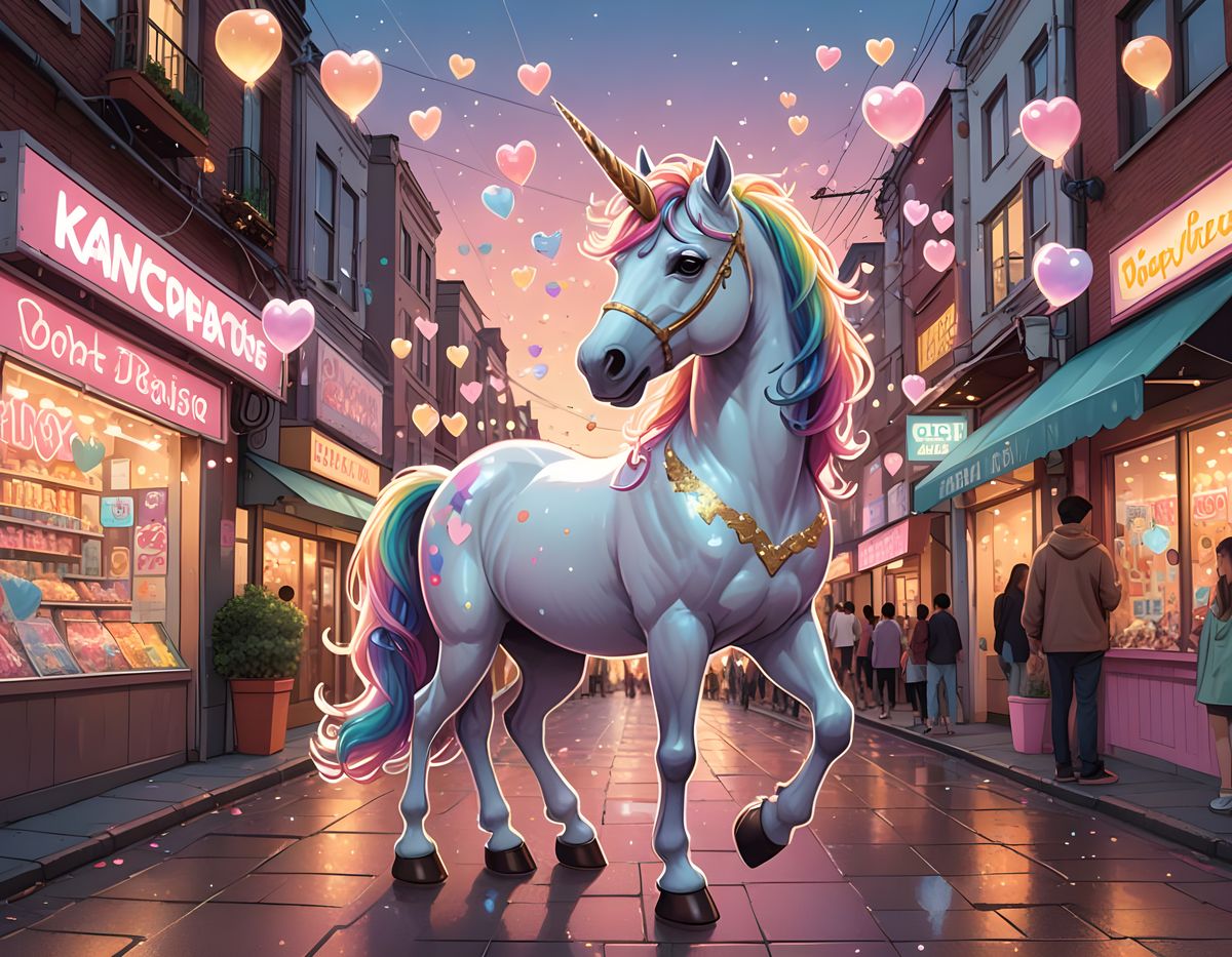 This image shows a magical unicorn with a pastel rainbow mane walking through a kawaii city street at sunset. The digital illustration has a whimsical atmosphere in a Japanese aesthetic.