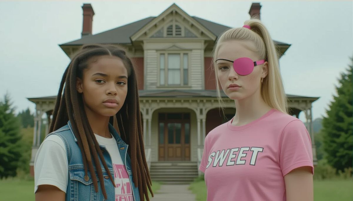 A cinematic film still captures two teenage girls in front of an abandoned Victorian villa. Features cinematic lighting and film grain for an atmospheric, dramatic effect.