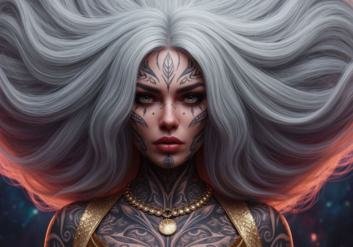 This image shows a woman with long, translucent hair and full tattoos, wearing ornate clothing. The artwork blends digital abstract art with 3D rendered photorealism, creating a mystical atmosphere.