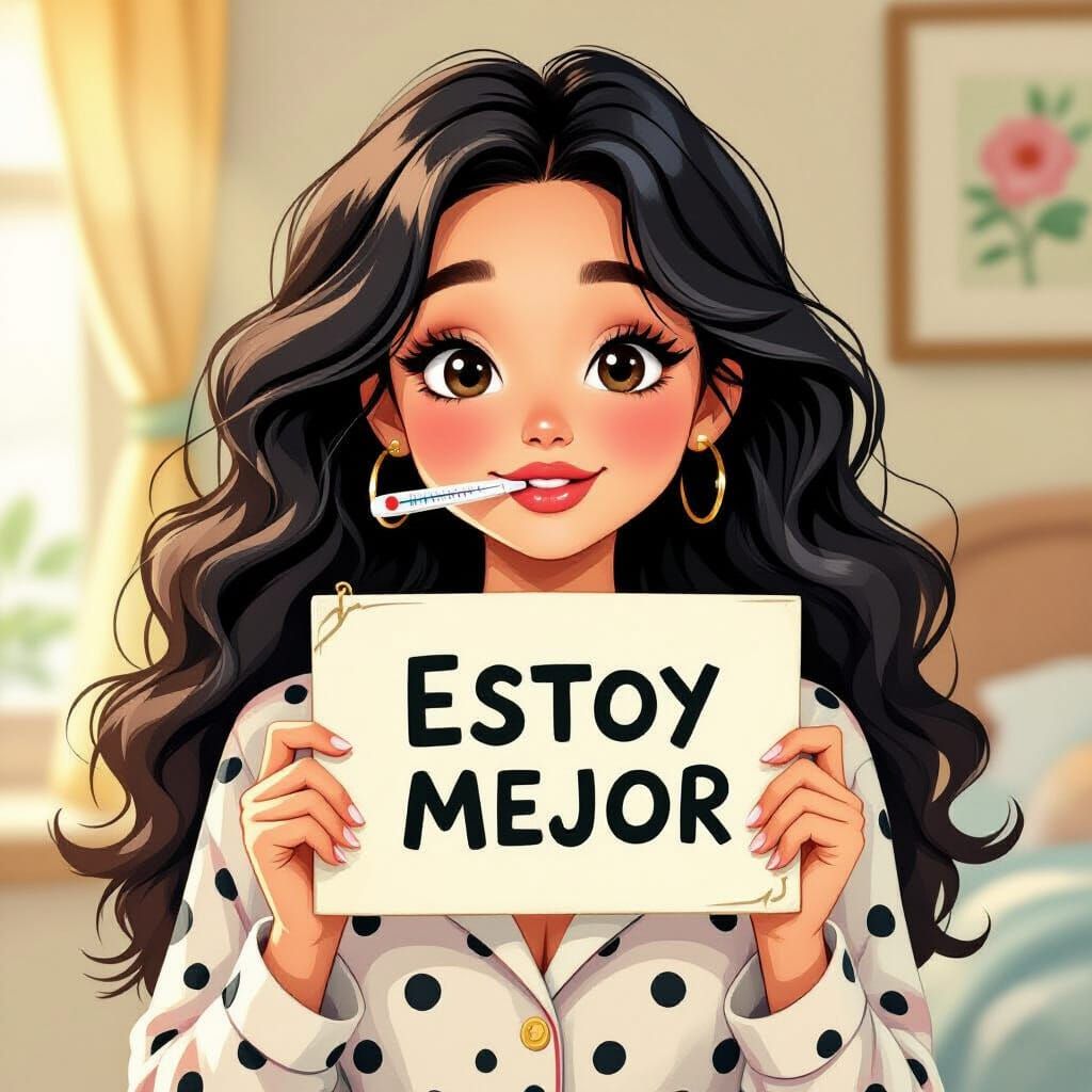 This image shows a cheerful woman with wavy black hair and round black eyes, holding a sign that says "I'M BETTER". She wears polka dot pajamas and has a thermometer. The art style is whimsical and illustrative, with bright colors and soft focus.