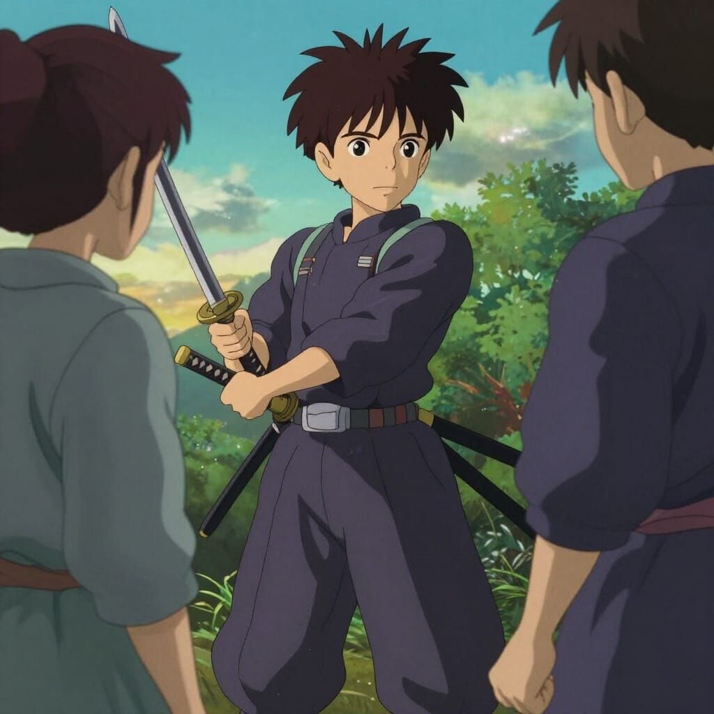 This image shows a young samurai apprentice ready for battle with his katana drawn. Rendered in a detailed anime key visual style with vibrant colors and atmospheric lighting.