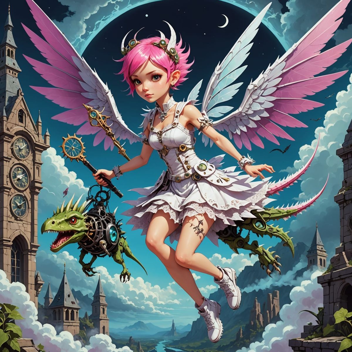 A gothic fairy with neon-pink hair rides a clockwork pterodactyl. Bioluminescent clouds fill the Jurassic sky around ancient ruins. The fairy wears a white tennis outfit with clockwork gears in an art nouveau style.