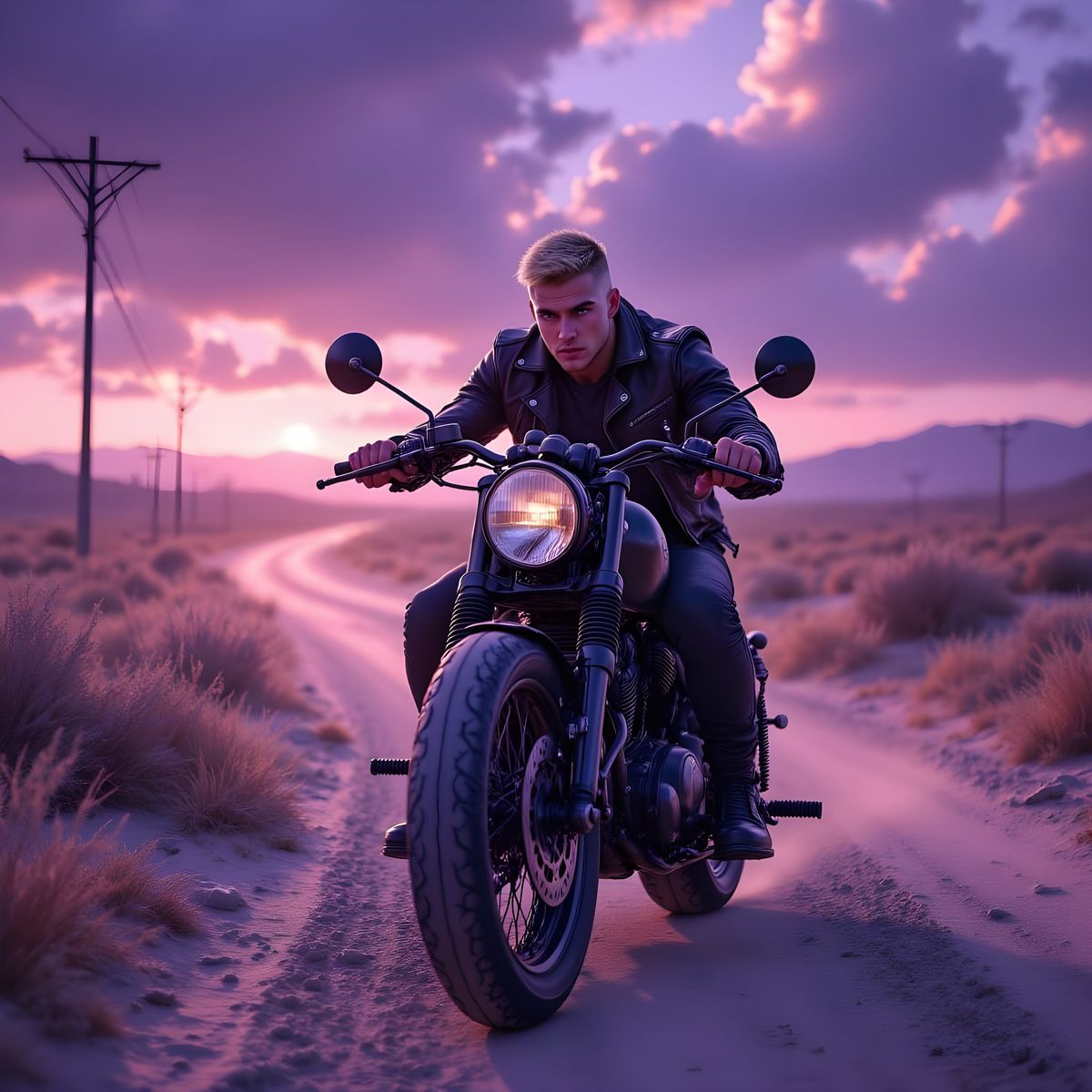 This image shows a lone, muscular motorbike racer on a dusty road in a stormy, apocalyptic wasteland. Rendered in a high-contrast oil painting style, it features dramatic shadows and a moody atmosphere.