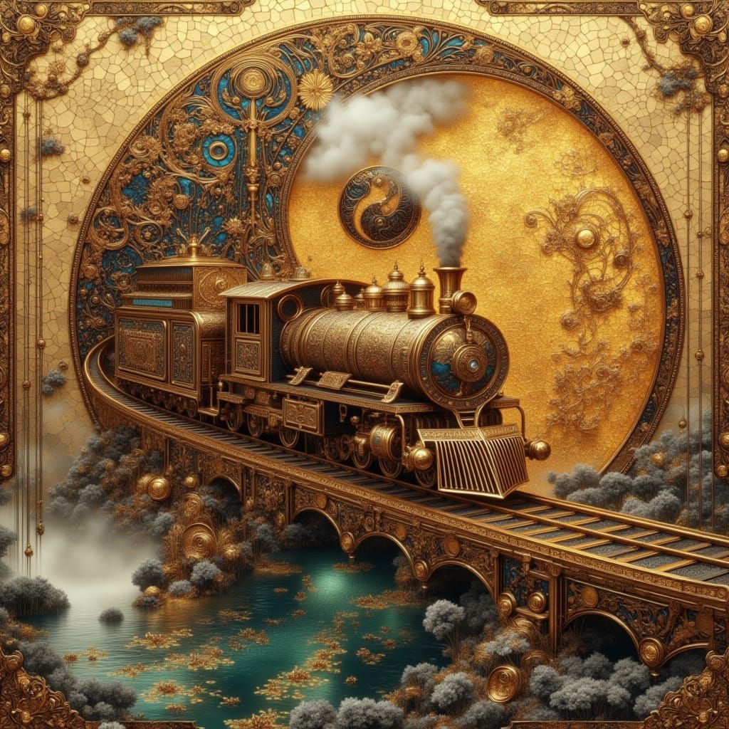 This image shows a luxurious steam train heading towards a bridge over water. The artwork features metallic textures and intricate details in a retro-futuristic style with a warm, luminous color palette.