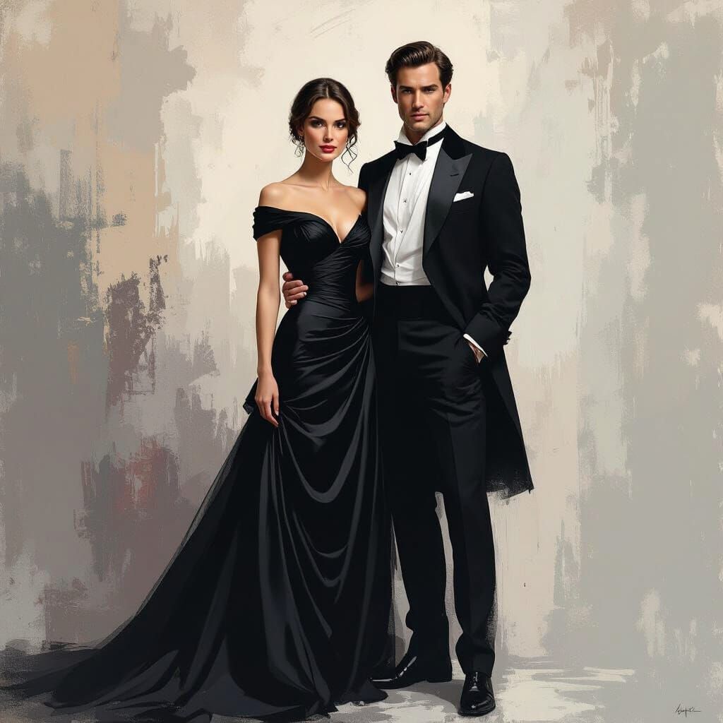 This image shows a woman in an elegant black dress standing with a handsome man against a dramatic backdrop. The artwork blends abstract expressionism with neo-noir elements, presented as a detailed matte painting in 8k resolution.