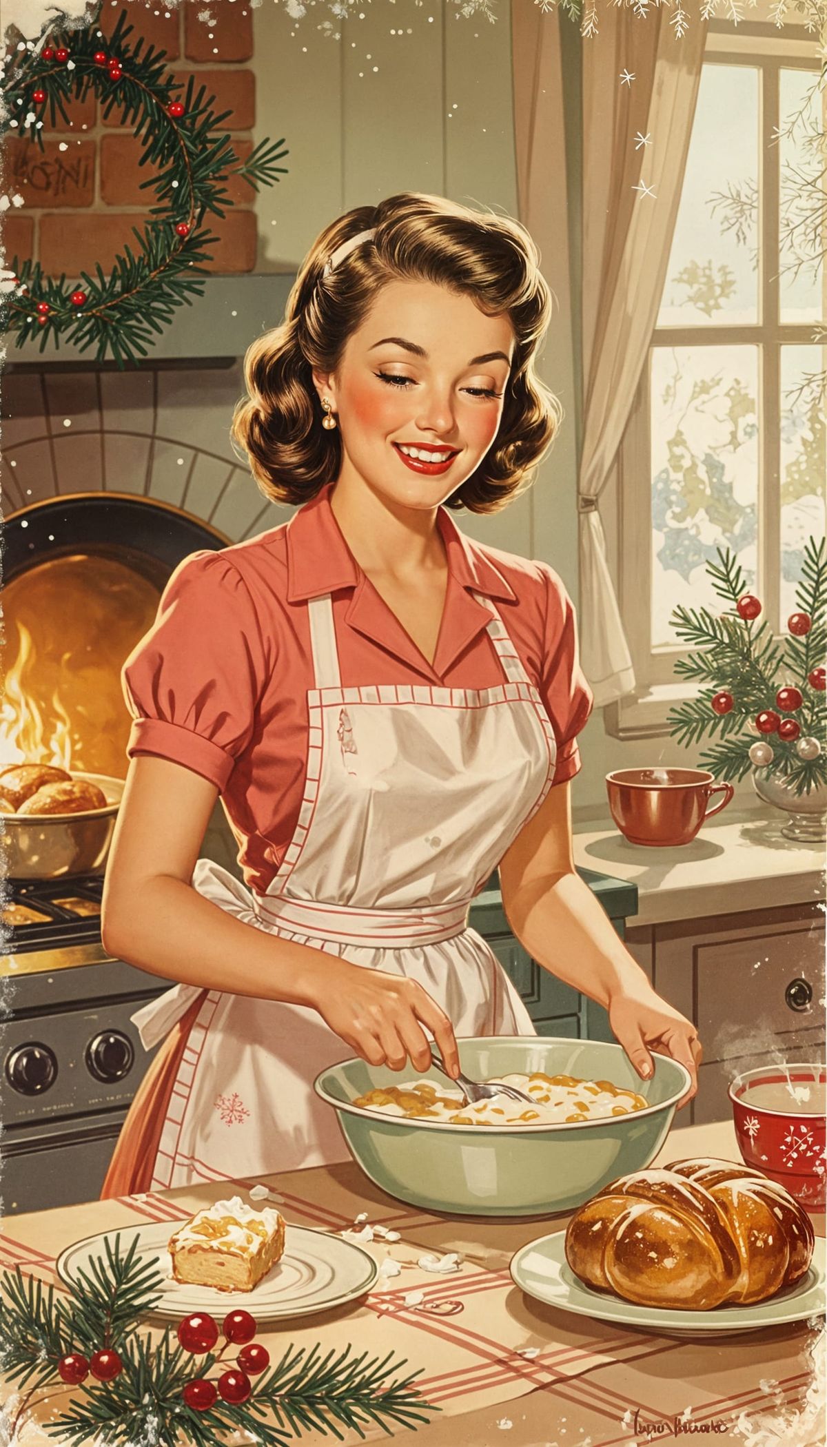 This image shows a charming vintage illustration of a woman preparing Christmas dinner, evoking the nostalgic aesthetic of 1940s and 1950s postcards.