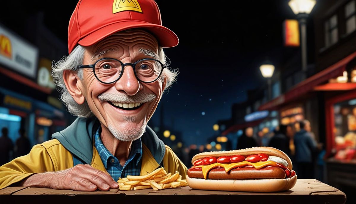 This image shows a photorealistic portrait of a smiling hotdog vendor at night, with a colorful hotdog in hand and a starry sky behind him. The vendor's face is elongated and cartoonishly exaggerated, with a perfect aged look and a McDonald's-style cap.
