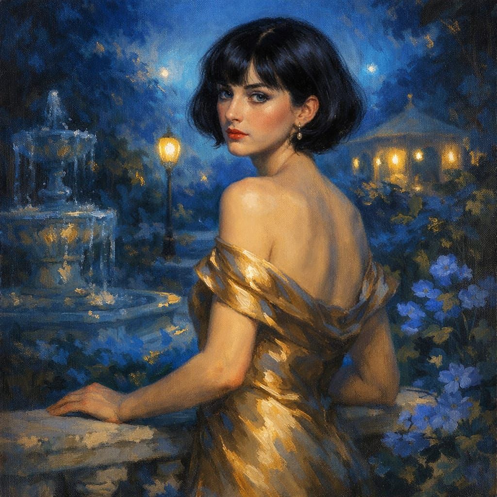 a painting of a pretty modern noir female with short black hair, blue, gold, pretty pose, elegant, garden, dark, in the style of nostalgic paintings, electric bluedreamscape, the 1990s, dreamy vignettes, magewave, childhood arcadias, john singer sargent --ar 1:1 --v 6.0