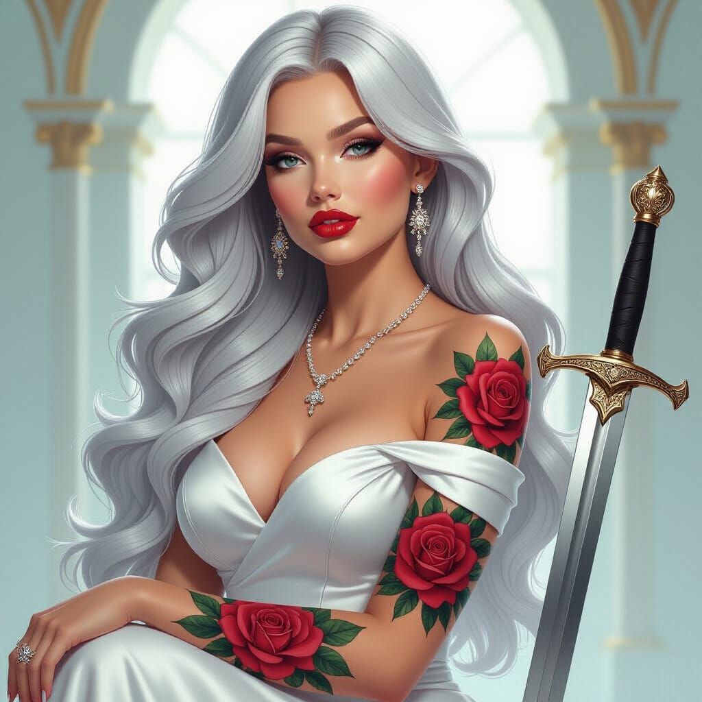 This hyperrealistic illustration features a woman with flowing silver-blonde hair and a white satin dress. Her arm displays a detailed tattoo of three roses and a sword, presented with smooth skin and a dollface aesthetic.