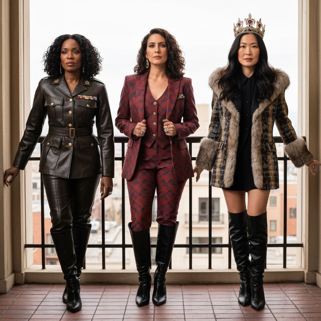 This image shows three women of different ethnicities standing on a balcony. Each woman is wearing a unique outfit with distinct colors, patterns, and styles, including military, business casual, and regal attire.