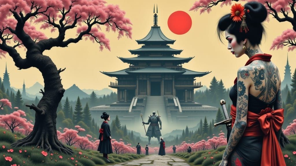 This image depicts a tattooed goth geisha and a cyborg samurai gazing at a colossal temple. Rendered in a Japanese woodblock print aesthetic with soft focus and moody lighting.