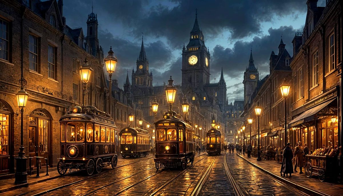 This image depicts a reimagined steampunk London street at night, featuring glowing gas lamps, steam trams, vendors, and a mechanical cathedral bathed in golden light.