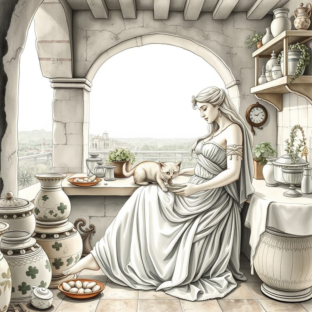 A pastel monochrome watercolor image of Aphrodite in an ancient kitchen, feeding a kitten. The scene has soft light, reminiscent of Qajar art, with subtle hints of elegant, poetic lines.