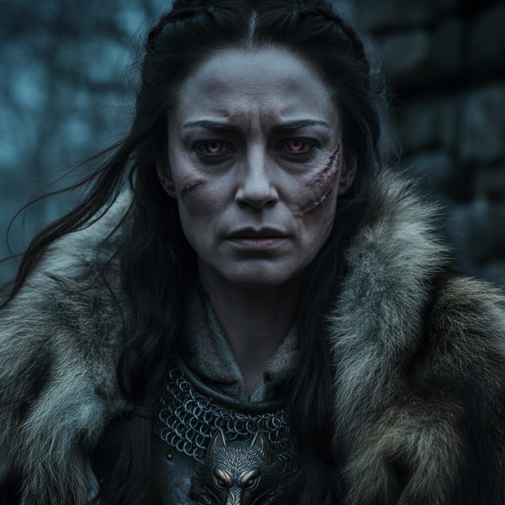 This image shows a Serbian female vampire warrior in a head and shoulders portrait. She has a stern expression, wind-blown hair, and battle scars, wearing chainmail and a fur-lined cloak. The aesthetic is realistic medieval fantasy.