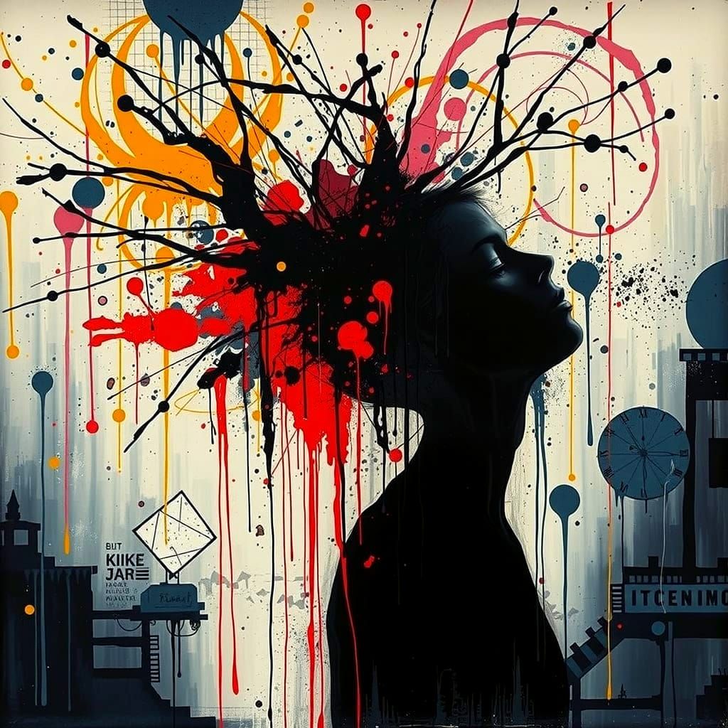 This artwork shows a black silhouette with closed eyes, symbolizing a savant's mind, with vibrant color splashes and graffiti elements in a grunge-inspired, mixed-media impasto style.