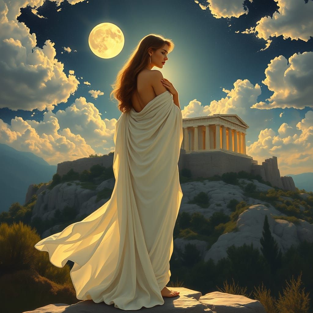 This image shows the goddess Selena in flowing white robes, glancing over her shoulder. The Acropolis temple is behind her silhouette against a moonlit sky, in a dreamy ethereal style.