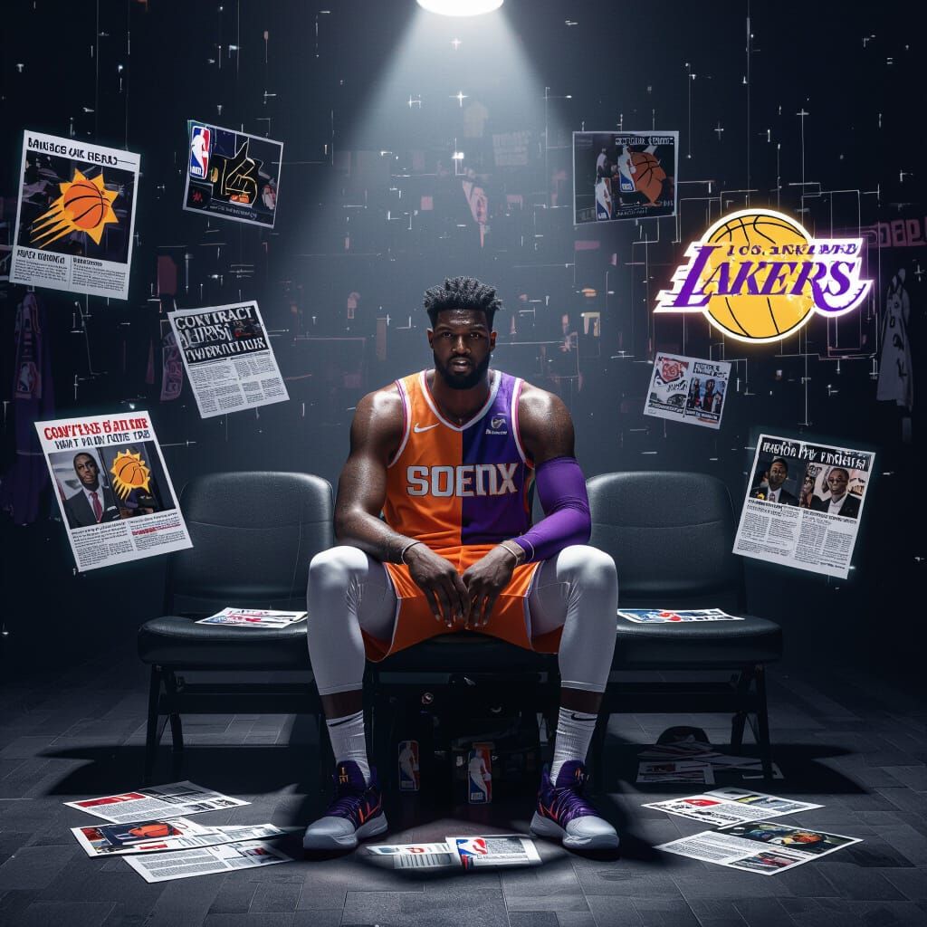 A dramatic image showing a basketball player in a locker room, caught between two teams. The scene is moody and cinematic, with scattered news headlines adding to the suspense and tension.