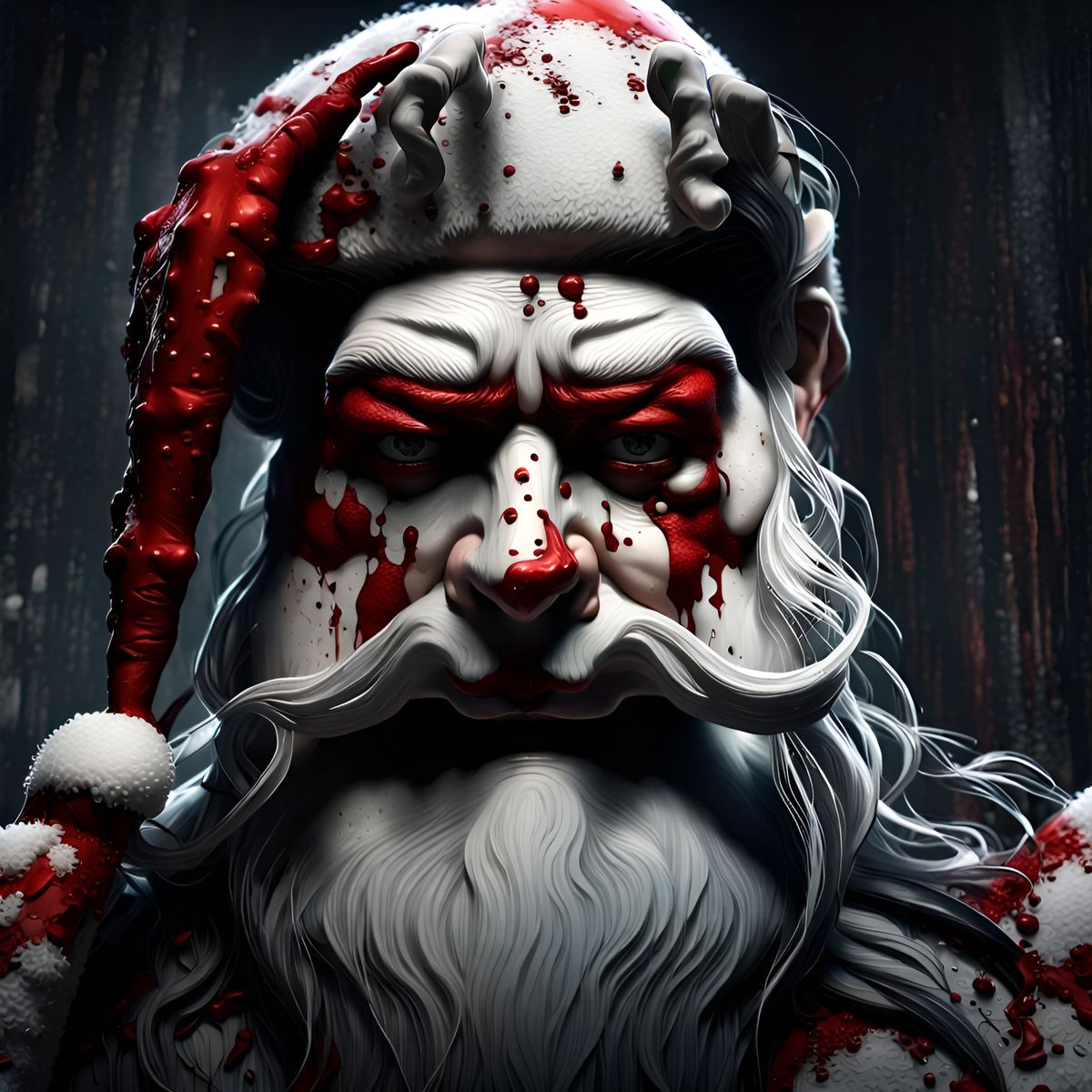 This striking image depicts a gothic clown being beaten by Santa Claus. The scene is rendered with extreme detail, high contrast, and dynamic lighting, creating a cinematic and moody atmosphere.