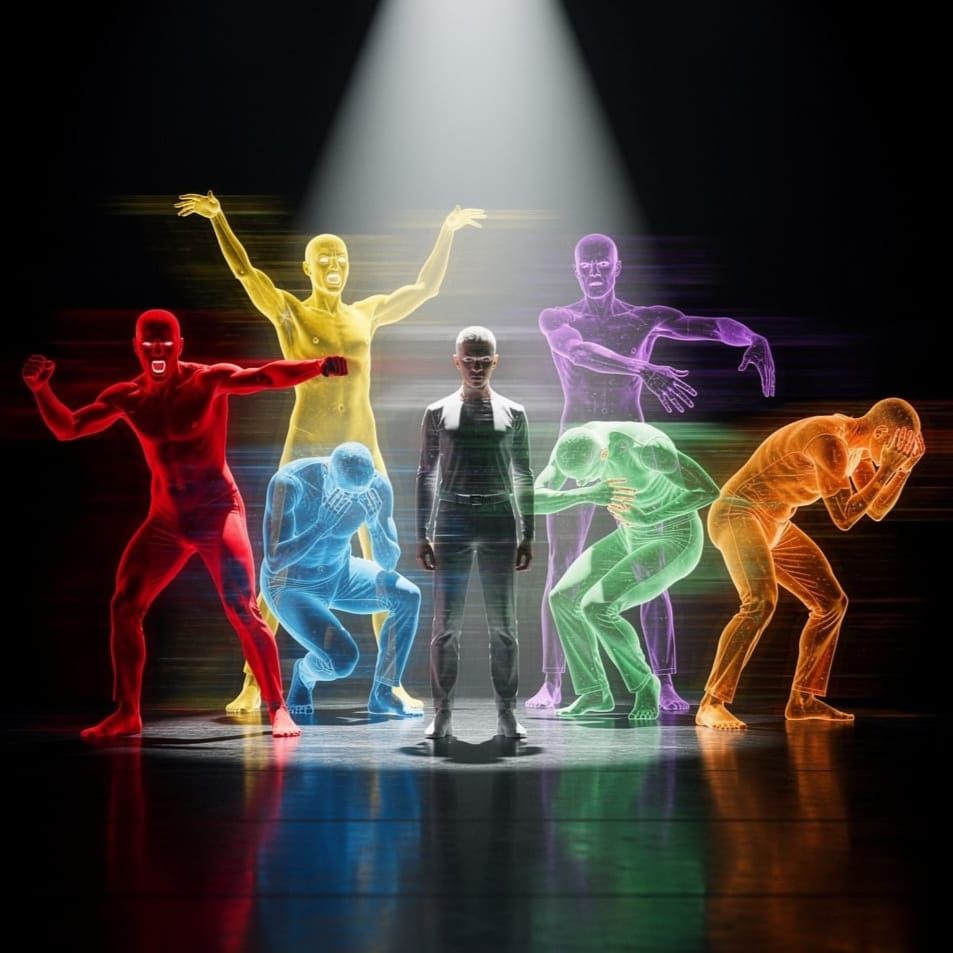 This image captures a central human figure surrounded by superimposed, blurred afterimages representing various emotional dance poses in vibrant colors. Performance art photography style.