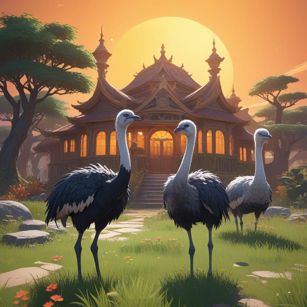 A vibrant 3D anime image of a fantasy ostrich house on the African savanna. Ostrich children play as sunlight shines through feathers in this warm-toned, detailed scene.