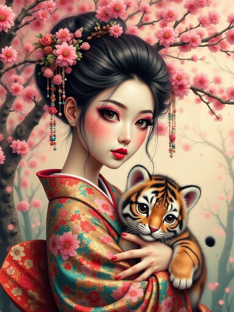 This enchanting image depicts a serene geisha woman surrounded by vibrant pastel hues, gently cuddling a playful tiger cub under a majestic cherry tree, showcasing intricate details and big, shiny eyes.