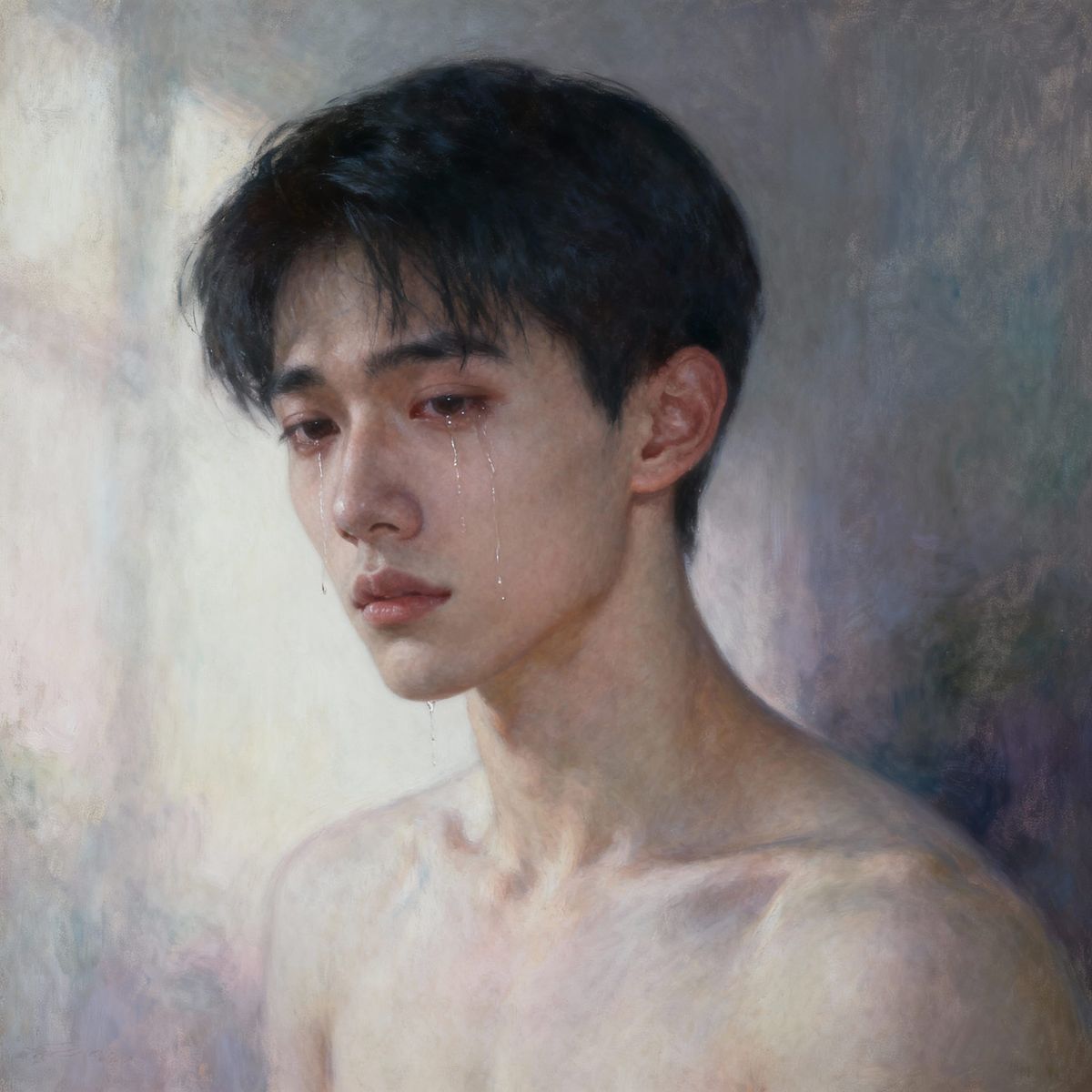 This striking image depicts an androgynous young Asian man with tears on his face, conveying a profound sense of sadness. The artwork is rendered in a style reminiscent of Pavel Tchelitchew and Gaston Bussiรจre, emphasizing aesthetic gay art.