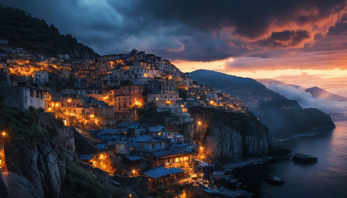 A picturesque coastal village basks in the warm glow of sunset. The watercolor and ink artwork shows golden light on rooftops, dramatic clouds, and luminous color, creating a cinematic and atmospheric scene.