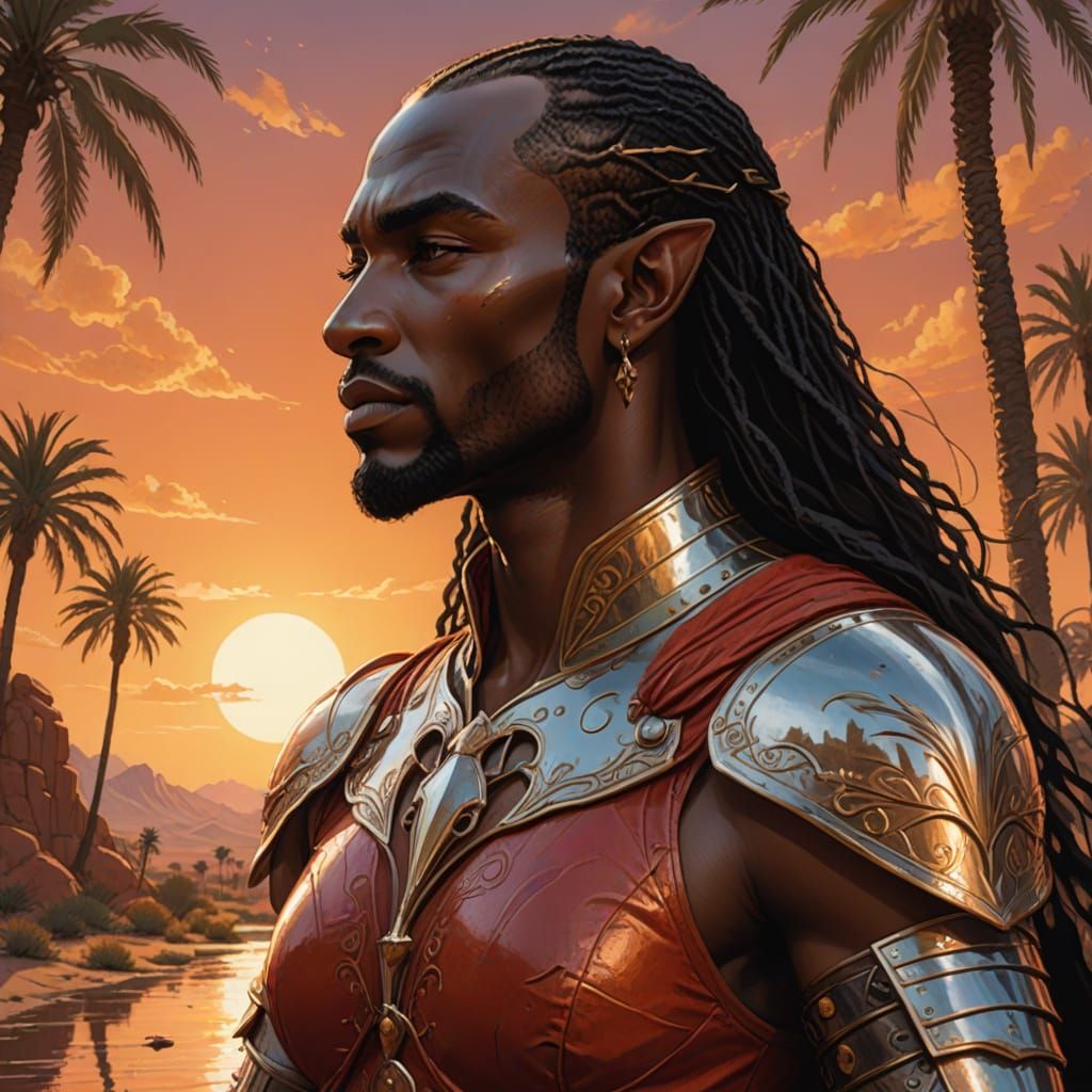 This image shows a romantic moment between a beautiful elf and a muscular warrior in a serene desert oasis, surrounded by palm trees and a warm, sunset sky, with a sensual and hyperrealistic atmosphere, inspired by classic fantasy art.