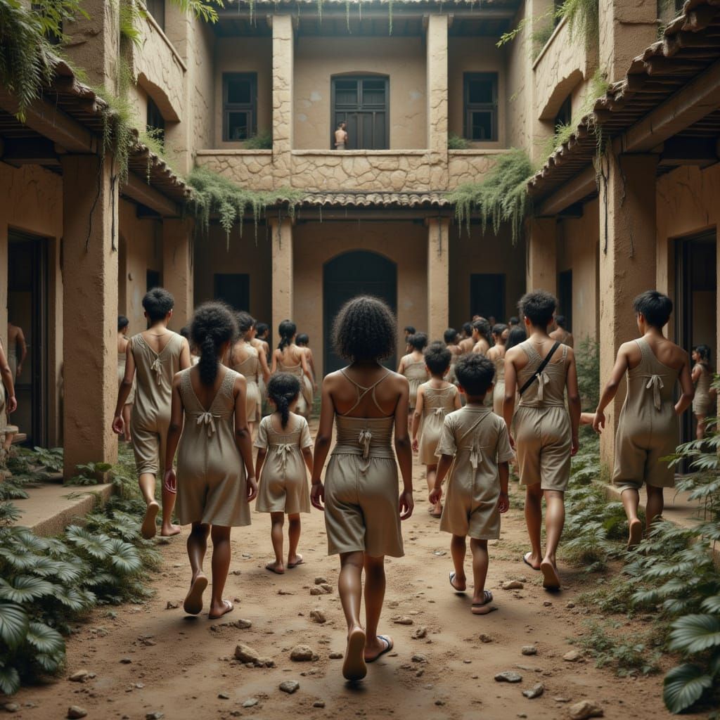 Cinematic realism portrait of a proto-cooperative city built from natural materials. Features communal voids, astronomical alignment, and interwoven vegetation, rendered with earthy textures and ambient light.