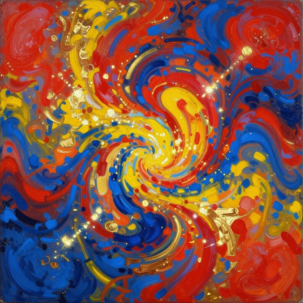 This image showcases a vibrant abstract painting with swirling colors and dynamic textures. Bold brushstrokes in fiery reds, deep blues, and electric yellows create a sense of pure emotion and energy, with luminous, glowing elements.