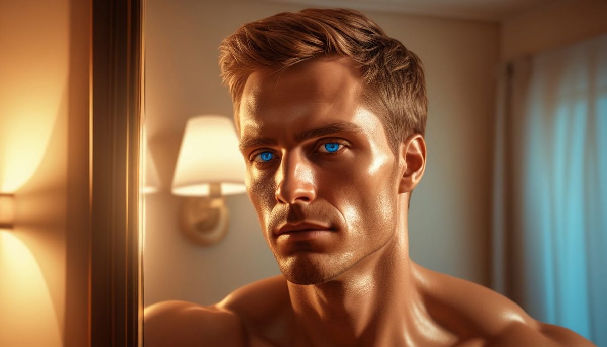 This hyper-realistic digital artwork showcases a man with chiseled features and glistening blue eyes admiring his reflection. The scene is bathed in warm, golden light, highlighting detailed textures and vivid colors.