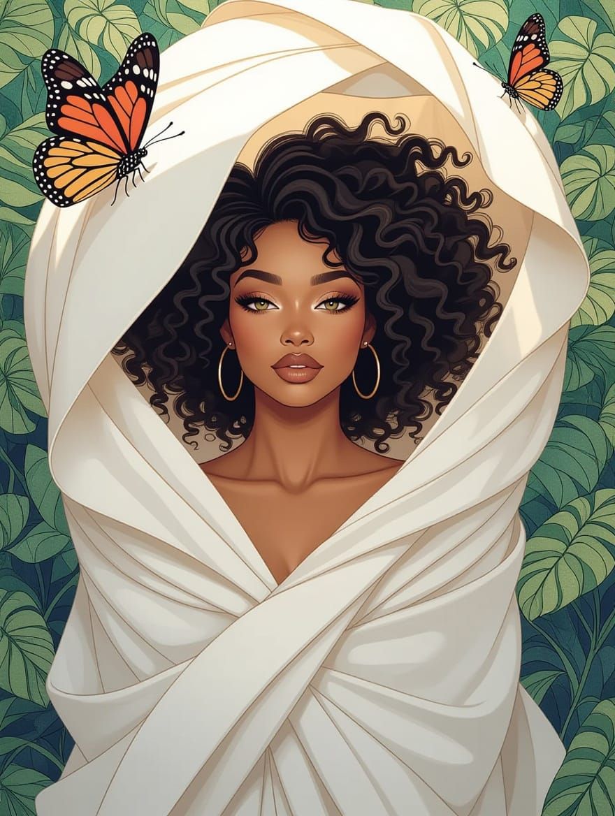 A striking picture of a Black-American woman with an afro, emerging from a cocoon. The portrait features flowing white attire, a surreal backdrop, and magical, glowing effects in a watercolor and woodblock print style.