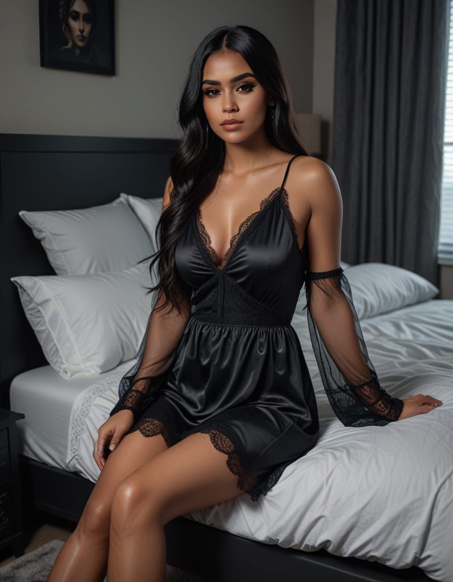 This image shows a beautiful 22-year-old Dominican woman with long black hair and gray eyes sitting in bed. She has an athletic build and is wearing a gothic nightgown and wedge shoes.