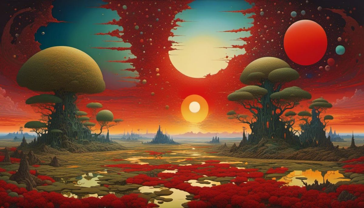 This image shows a barren landscape under a massive red sun. A thermal flash engulfs the sparse vegetation in a surreal, sparkling style.