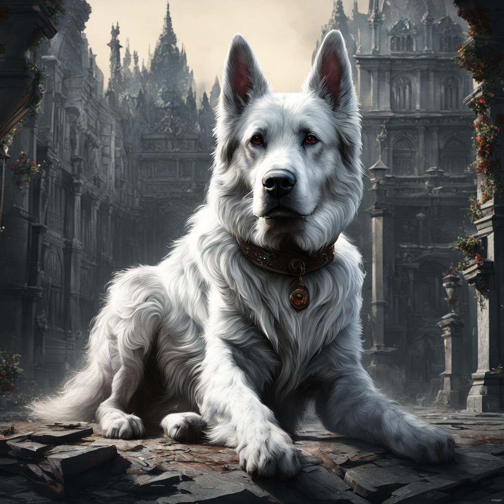 A detailed matte painting of a white Swiss Shepherd dog. The image features complementary colors and intricate details, rendered with thick brush strokes in gouache and watercolor on canvas.