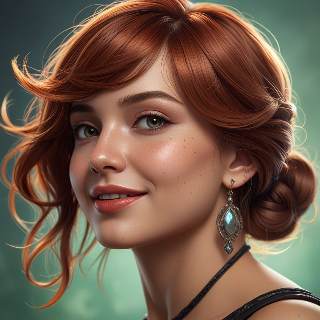 A hyperdetailed, photorealistic close-up portrait of a 25-year-old woman with tanned skin, faded red hair, and striking gothic makeup. Features dynamic lighting and intricate details.