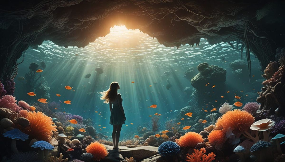 This image shows a woman's silhouette created by a double exposure of a coral reef and cosmic energy. Sunlight illuminates exotic fish and the reef's structures in ethereal fantasy art.