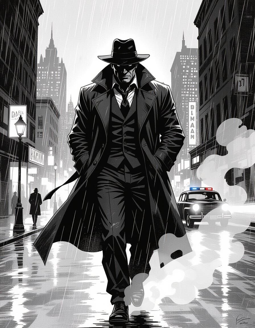 A gritty comic book cover shows a noir detective on a rain-slicked street. Rendered with textured linework and stark contrast, capturing a tense, cinematic mood.