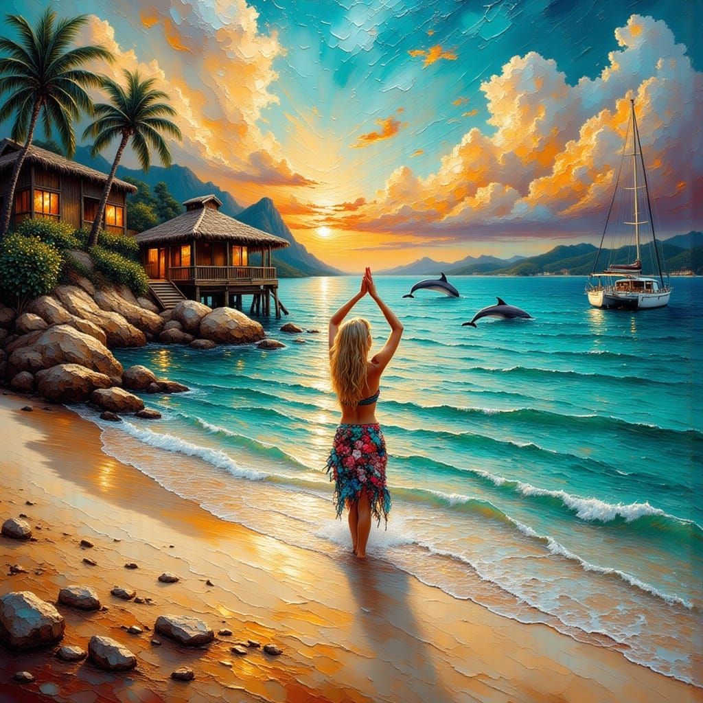 Where the water breathes in soft rhythms and the sky learns how to glow, the world loosens its grip. Palms sway, dolphins arc like quiet blessings, and the horizon opens without asking for anything in return.