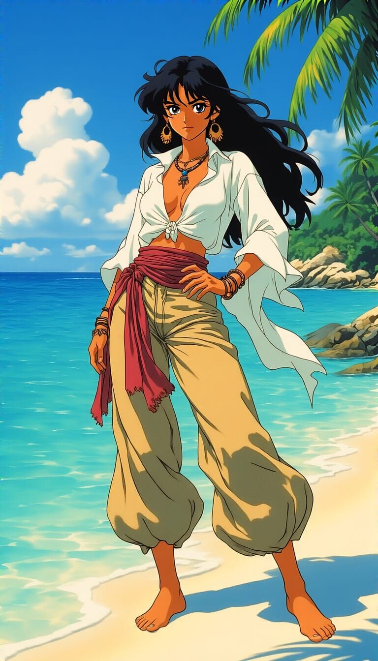 This image shows an Arabian pirate girl standing on a tropical island beach. The vibrant scene is rendered in a fantasy anime style, reminiscent of 1980s animation.