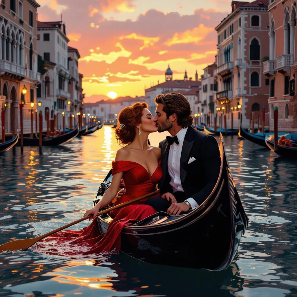 This image captures a passionate kiss between a sophisticated woman and an Italian sportstar in a gondola on a Venetian canal during a sunset. Rendered in a rich, painterly style with dynamic lighting.