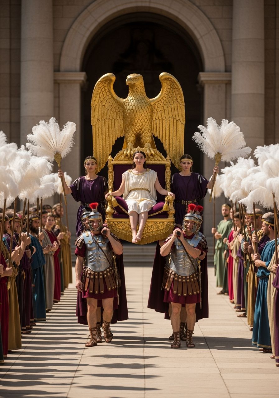 This image shows a Roman Empress being carried on a golden eagle throne by soldiers, with servants and kneeling peasants. The photograph features a shallow depth of field and natural lighting.
